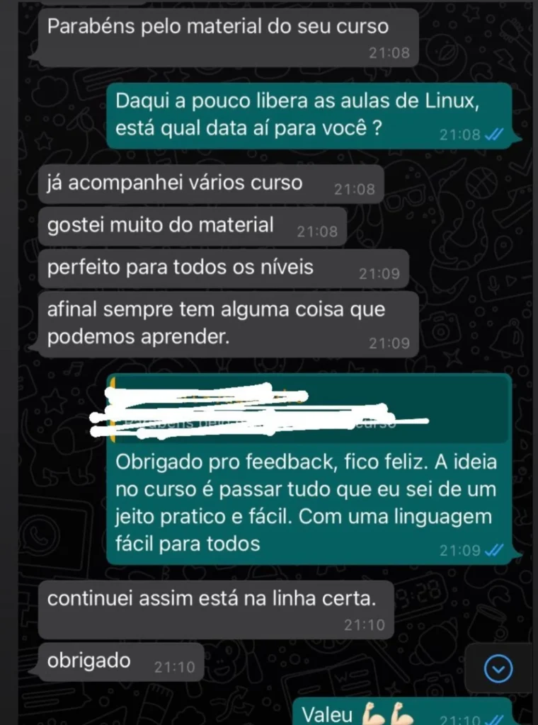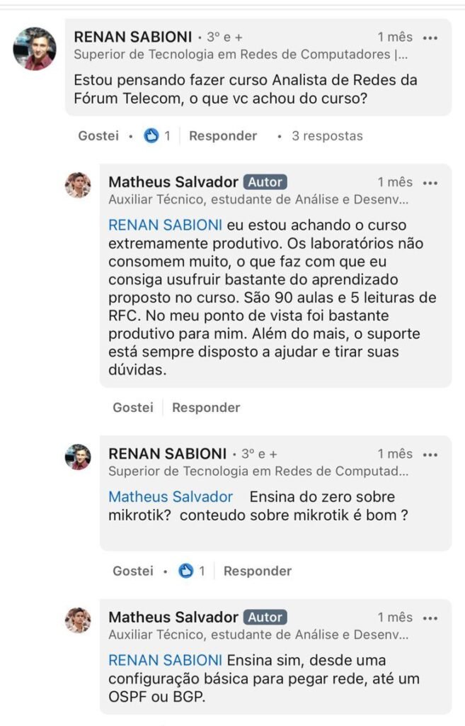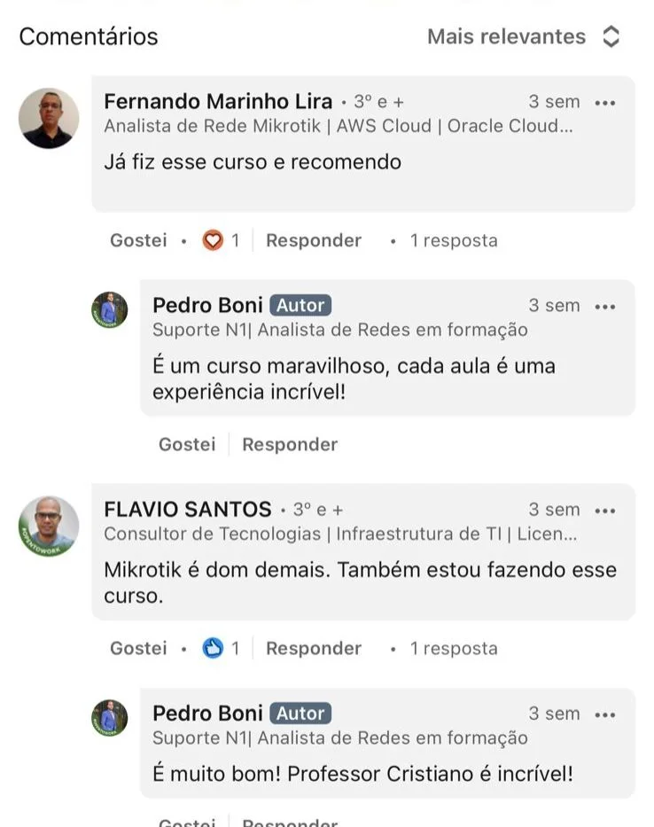Curso concluído com sucesso, gostaria de agradecer a você Cristiano pelo conteúdo passado durante as aulas, hoje tenho uma nova visão sobre redes aprendi muito mesmo com você, sinto confiança agora em gerenciar qualquer rede.